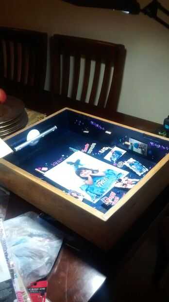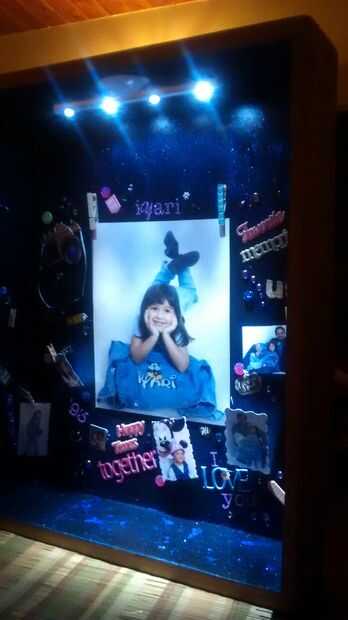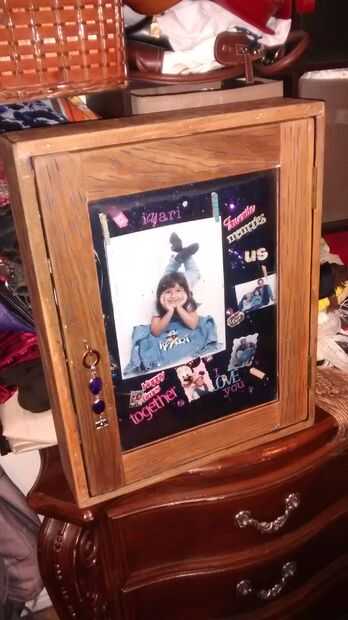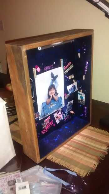 He añadido varias etiquetas engomadas en Michaels. He dejado unas pinzas pequeñas sin fotos para mi hija agregar desde el lote de fotos de ella que voy a presentar con la caja de la sombra. He añadido que una fuente de luz en el interior del gabinete para efecto agradable con pilas. Por último, he añadido un pergamino con un mensaje personal de mí que cuelga en el interior de la puerta a la caja de la sombra. Como se puede ver por las imágenes el proyecto salió bien.