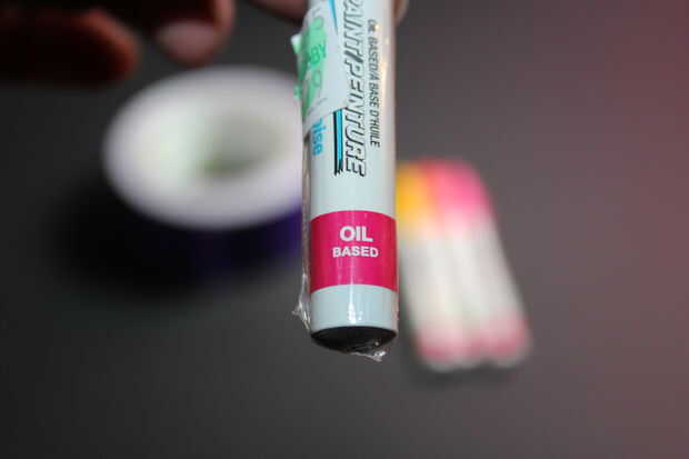 Cuatro marcadores de pintura de aceite (Si usando diferentes colores hacen que mostrará en negro) Usé, amarillo, turquesa, naranja y caliente.