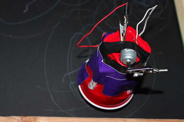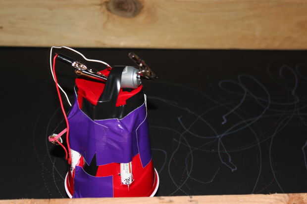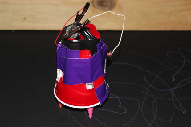 Artbots famoso es divertido crear y ver dibujar. Una de las formas más comunes de les alimentación es utilizando un circuito simple con una batería y un motor de CC con un peso de compensación para crear vibración. El centro de equilibrio del motor h