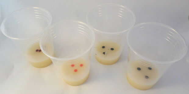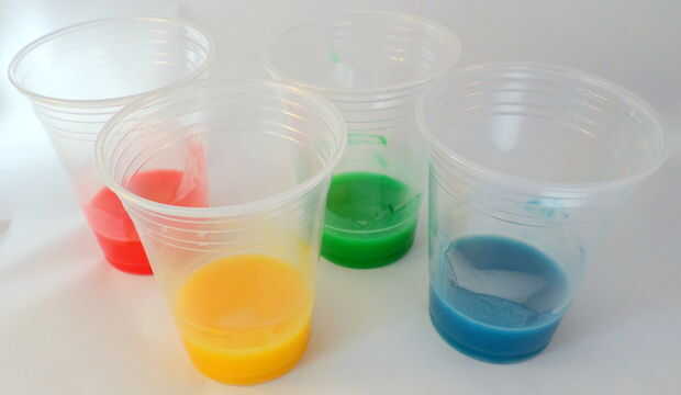Cuando la pintura comestible se hace, deja que se enfríe un poco y luego dividido en tazas iguales que el número de colores de pintura diferentes que desea hacer. Para mí, decidí probar cinco colores: llano (blancuzco, ligeramente amarillo), amarillo, verde, rojo y azul. Ya preparé 2 tazas de pintura comestible, dividiendo esto por cinco colores ascendió a 0,4 tazas de pintura comestible por copa/color. Esto parecía una buena cantidad.