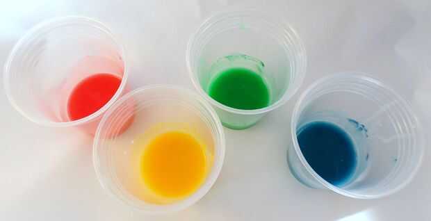 Para hacer el amarillo, colores verde, rojo y azul, he añadido 3 gotas del colorante adecuado a cada taza de la pintura y luego mezclados. Los colores eran brillantes y hermosos!