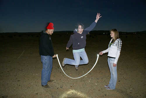 Esta imagen me puse dos de mis modelos que estaba sosteniendo una cuerda imaginaria. Luego tuve el tercer modelo se interponen entre ellos y saltar. Cuando tenía aire espetó el flash. Entonces tenía su paso de la imagen y 'Saqué' en la cuerda con la linterna.