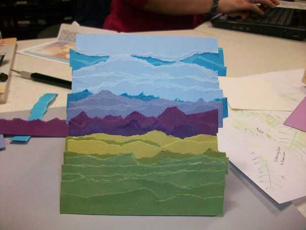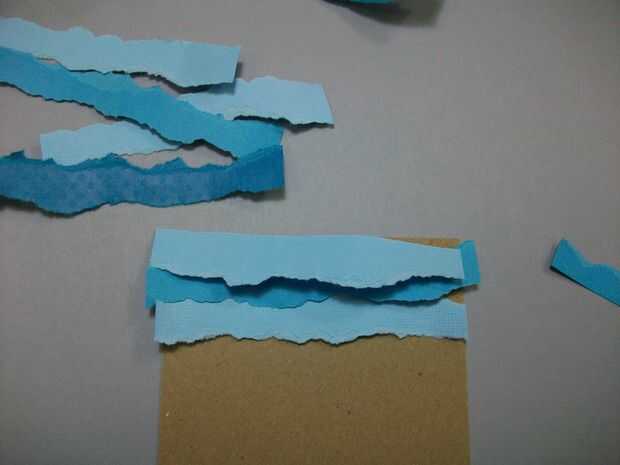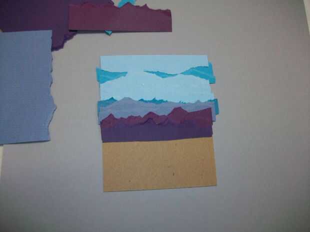 Romper suficientes tiras para completar al menos una sección del fondo. En este caso, el cielo y las montañas.