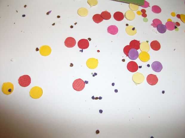 Las flores fueron creadas por perforación hacia fuera de los círculos y luego corte y formarlos. Los tallos fueron creados por cortar tiras muy finas con unas tijeras o una cizalla. Las flores pueden montarse en una gota de pegamento, colocada sobre papel encerado. Cuando el pegamento se seca la flor se puede pelar apagado el papel y colocada en la obra de arte. Para facilitar el pegado; poner otro punto de pegamento en el papel encerado y los tallos a través del punto de arrastre. Adornar con las flores silvestres como desee. Adiciones opcionales pueden añadirse para mejorar las flores. Granos de cristal se pueden pegar como centros de flores, brillo puede ser utilizado como la escarcha o la nieve, experimento y divertirse con el embellecimiento. Marcadores base de agua y lápices de colores pueden utilizarse para realzar la pieza.