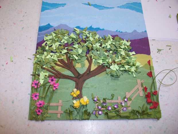 Mirando los trozos de papel disponibles, pensé que un árbol de principios del verano sería el mejor, tal vez con algunas flores silvestres y una valla.