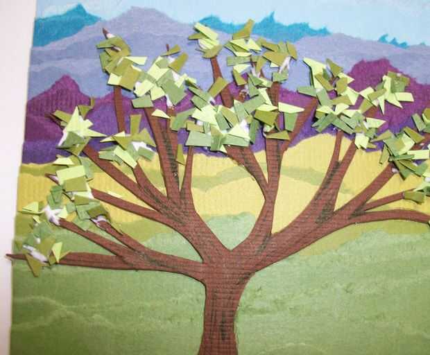 Una manera fácil de crear las hojas para el árbol: cortar papel verde en tiras finas; luego con unas tijeras de detalle, corte triángulos pequeños a lo largo de la longitud de la tira. Está bien para variar los tamaños y formas de estas piezas. Además, las tiras pueden ser arrugadas, antes de cortar, para dar dimensión a las "hojas".
