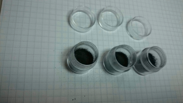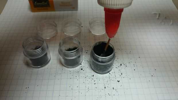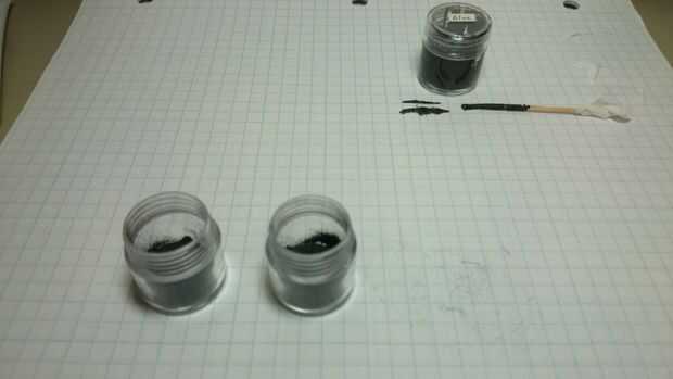 Para la primera receta grafito en polvo se mezcló con pegamento-todo de Elmer hasta la consistencia para untar. Tenga cuidado al agregar el pegamento porque apretando la botella va a tirar una ráfaga de aire en la jarra y grafito en polvo soplará por todas partes. El tercer cuadro ilustra esto.