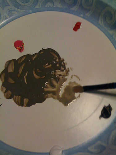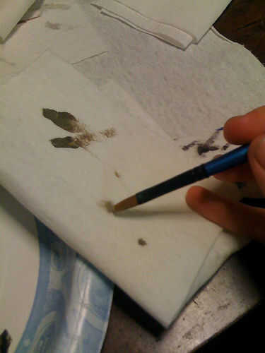 Diluir el color elegido (ya mezclado con medio textil) con mucha agua. Toque el cepillo a la toalla de papel para secar el exceso de agua de él.