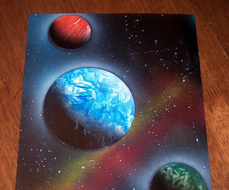 Sacar las placas para ver la pintura acabada. Este primer cuadro planetario debe darle una idea de lo que puedes hacer con el arte del aerosol. Seguir practicando para perfeccionar sus técnicas de