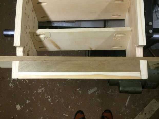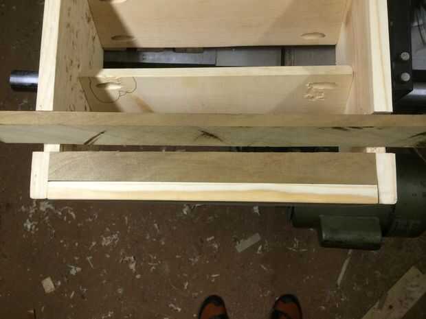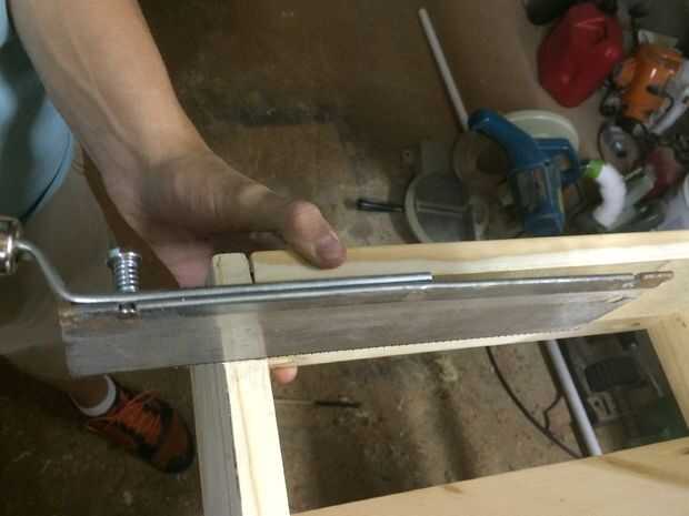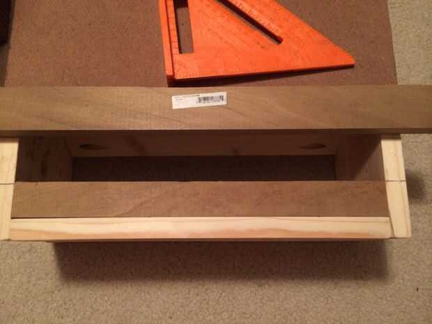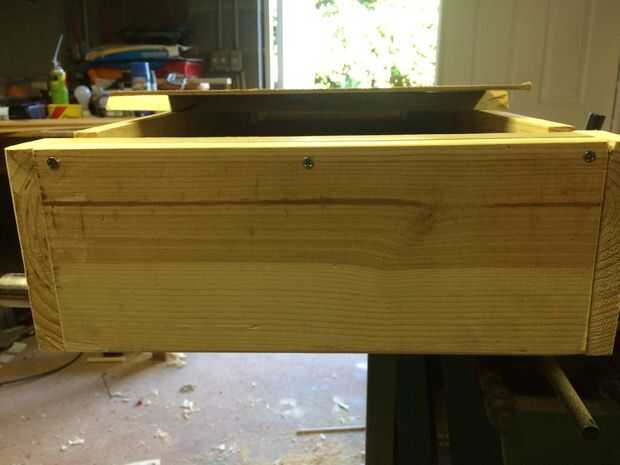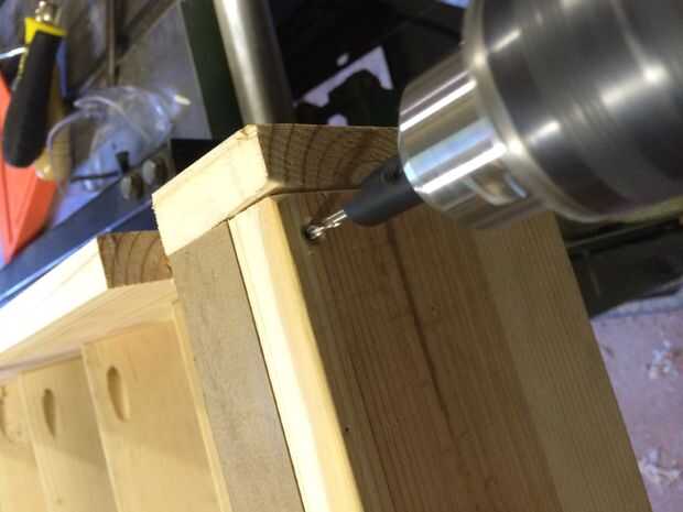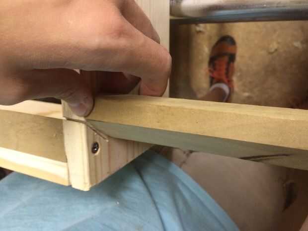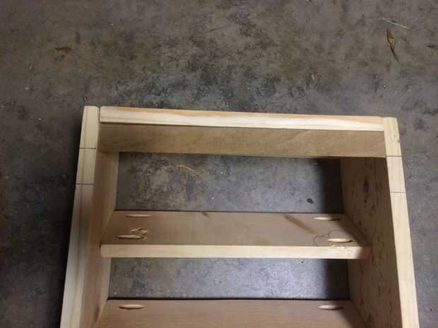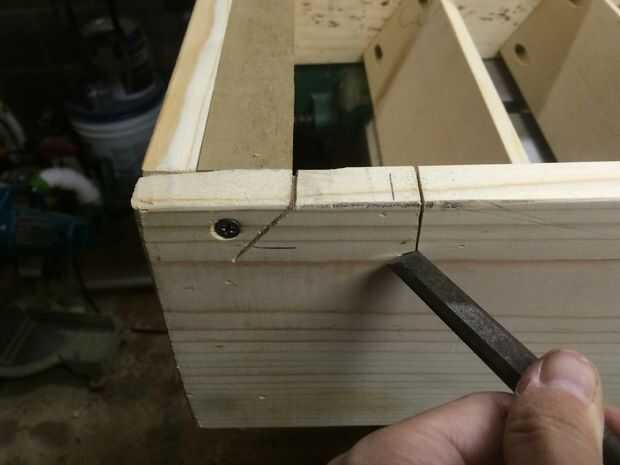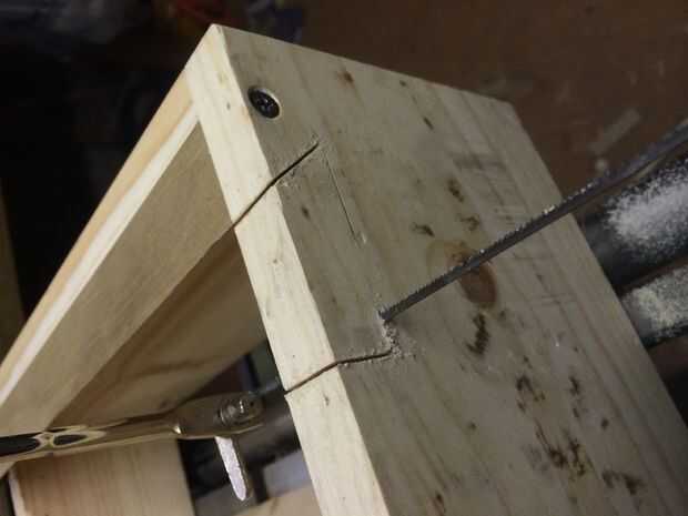 Para que la caída de la pintura de aerosol estante al ras contra la pared que necesitaba a la Cala francés la inserción y para tener un trabajo francés grapa que necesitaba para eliminar material en los lados. Para ello utilicé una combinación de una sierra de cola de Milano, Sierra de marquetería y un cincel (recomiendo la Sierra de marquetería para un corte áspero y el cincel para ser utilizado para limpiar los cortes). Empecé marcando donde necesito eliminar material. A continuación hice dos cortes rectos, uno siguiendo el ángulo de 45 ° de la Cala del francés y el otro hacia abajo donde había marcado. Después de conecté los dos cortes rectos con una sierra de marquetería. Lamentablemente intenté utilizar sólo el cincel al principio para acelerar las cosas a lo largo pero terminé partir al final de mi madera. Debido a esto que usted también verá que avellanado y atornillar la Cala francés en de la parte superior para asegurarse fue sólidamente unida.