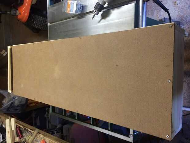 Este fue el más simple de pasos. Sólo usé #6 3/4" tornillos para madera para sujetar la tabla a la parte posterior de mi estante de pintura en aerosol. Utilicé 9 tornillos igualmente espaciados alrededor de la parte trasera que se puede ver en la foto de arriba. Para este paso que no se molestó a fregadero contrario los tornillos pues los tornillos en la parte trasera donde no muestran y el aglomerado es lo suficientemente suave como para que los tornillos de coche casi al ras con la superficie de todos modos.