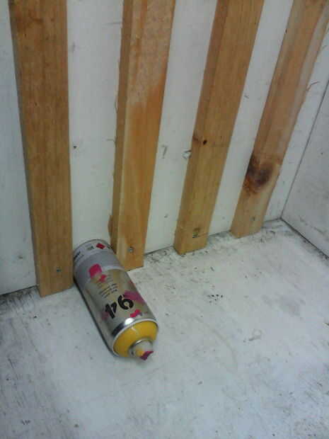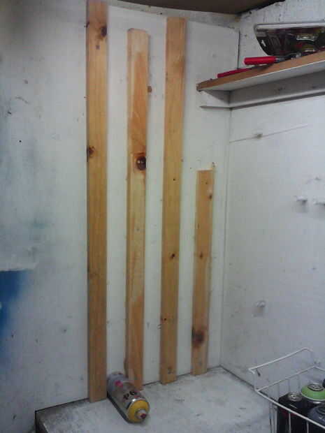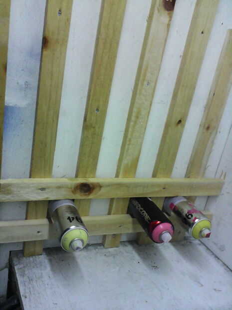 En primer lugar queremos añadir nuestras Porras vertical o verticales. Atornille a la pared y utilizar un par de latas de aerosol en cualquiera de los extremos para obtener la separación correcta. Merece la pena destacar en este punto que el espacio es crucial, demasiado juntos y no caben las latas, demasiado lejos aparte y las latas se desprenderán de su pared. Esto dijo su no demasiado difícil de conseguir el espacio adecuado.