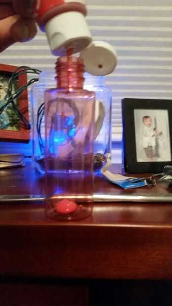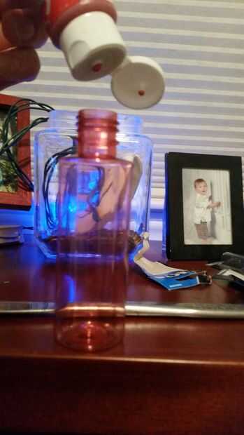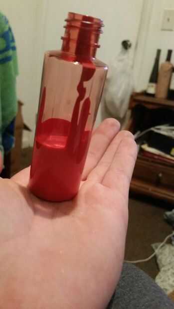 primero adelante y empezar pequeño basado en el tamaño de envase de spray de viajes. puse alrededor de la mitad o un poco más de la mitad de la pintura y un tercio de lo que puse en la pintura. tal vez una tapa de la botella llena de agua es de derecho. También he añadido un rodamiento de bolas en la mezcla para nuestro producto. y el sharpee... no sé por qué pero pensé que sería una buena idea cortar un trozo de la sharpee agallas y añadir a la pintura para darle un color más intenso leve así como permanente extra. mezcla agitar el spray!!