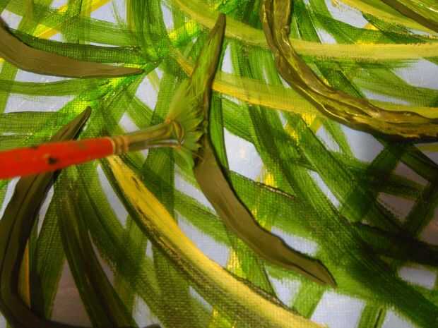 Con pintura verde y amarilla en un pincel de abanico, barrer suavemente cada hoja de hoja de palma para mezclar en la pintura.