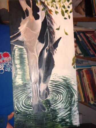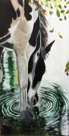 Recrea una pintura de un caballo bebiendo en un río. La original es de Lesley Harrison. Lo encontré en la revista "Artes del oeste" en su mayo / junio de 2008 edición. Usé un acabado al aceite y pinturas de acrílico. No trataba de ningún derecho de autor. Me encantan todos los animales y recientemente han descubierto que los animales de la pintura es muy agradable y relajante. Como principiante es más fácil para mí comenzar con una pintura actual y añadir mi propio estilo que como ir. Las pinturas son para mi uso personal, no venderlos.