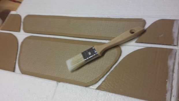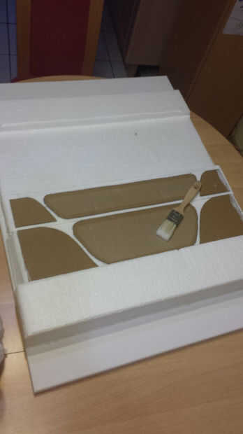 Lo nuevo que voy a utilizar pintura en aerosol para cubrir la espuma de poliestireno y también han encontrado la manera dura que grafitear come a través de la espuma de poliestireno. Lo primero de todo antes de continuar, he cubierto todo con 2 capas de cola para madera con un cepillo.