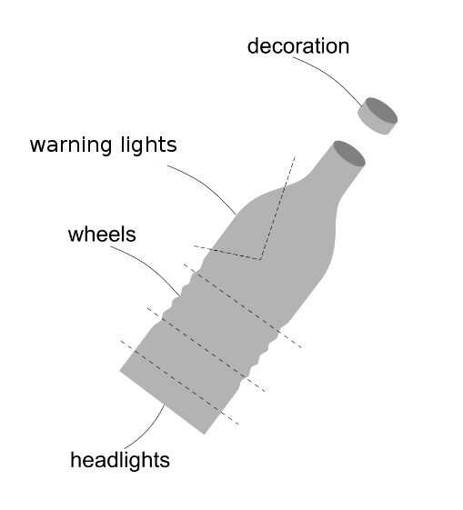 Para sirenas, ruedas, faros, etc. utilizan botellas de plástico. Ver la imagen que parte de la botella se utiliza para qué parte.