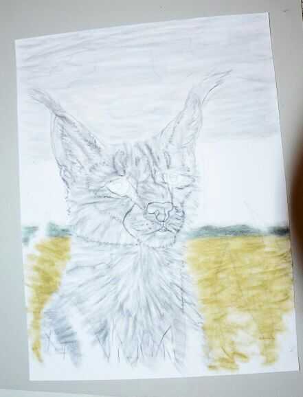 Ahora que tengo el bosquejo en lugar, escribir el subpelo. Use movimientos amplia va en la dirección de la piel en el caracal usando el borde - pero no la esquina - el pastel. Poner el fondo en usando el borde o el lado largo del pastel. Capa de la caracal es Cool gris 4. Comienzan las nubes con Cool gris 2, luego recubrirás con cielo azul. El campo es oro verde y los árboles distantes están verde de la puta superpuesto con el negro. En este punto, sólo utilizar pasteles, a menos que su bosquejo comienza se descolora, si es así, utilice un lápiz pastel o negro pastel duro para dibujar ligeramente las líneas. Utilice un tocón tortillon o mezcla para 'difuminar' el fondo.