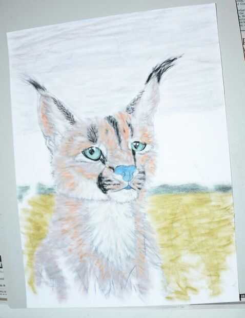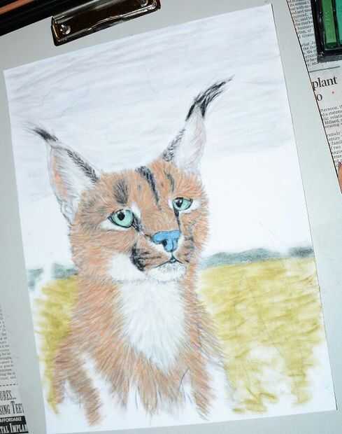 a continuación empiezo a añadir en la piel con un lápiz pastel oro. Película de la muñeca en movimientos rápidos, cortos, para retratar la piel. Ir a este con Brown. Añadir blanco y negro Si es necesario. Asegúrese de ir en la dirección que crece el pelo y no hacerlo demasiado largo. También, color de la nariz con un pastel suave medio azul de Phthalo.