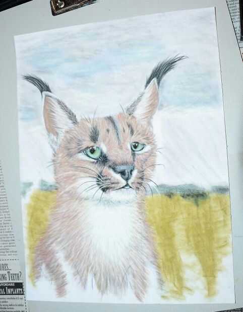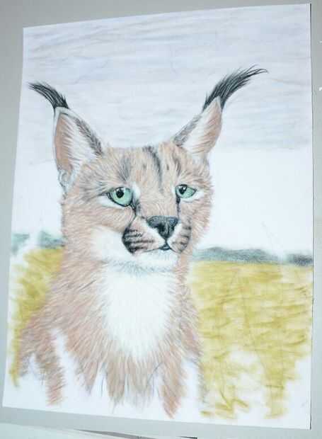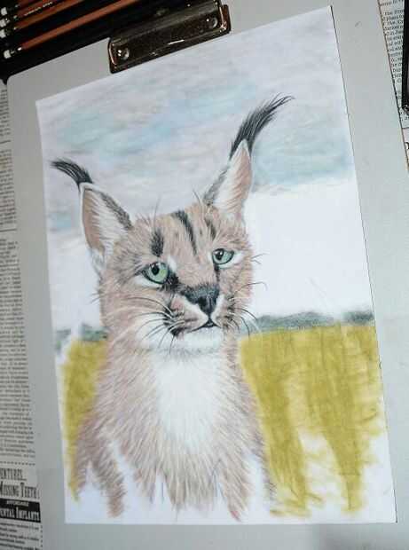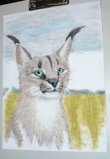 Agregar algunas líneas de radiación alrededor de la pupila en lápiz pastel amarillo; Luego, añadir algunos azul claro pastel duro azul cielo pastel suave y fresco gris 3, a las áreas oscuras de las nubes. Esto puede sonar un poco extraño para los nuevo para pastel, pero a continuación añadir el violeta y sanguina lápiz pastel a las zonas marrones de la caracal. Esto le da un tono más fresco que es mucho más atractivo a la vista. Agregar bigotes con pastel duro blanco y negro. Añadir un toque de sanguina y amarillento en los bordes de la pupila. Mejorar la nariz con otra capa de color de rosa sobre el parche y algún azul en las zonas más negras. Puede ejecutar sobre el campo una vez más con oro verde también. Como una decisión de último minuto, también decidió utilizar un frío gris 2 para hacer las hojas de la lluvia en la distancia.