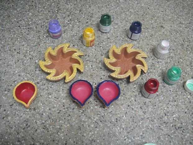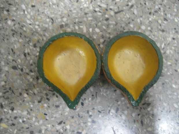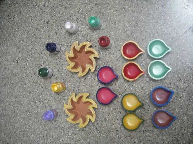 Una vez que la pintura esté seca, aplique una capa de barniz en las velas. Esto es para asegurar que las pinturas no pelan el diya lleno de aceite. No siempre sucede. He utilizado diyas sin barniz o cualquier capa y la luz muy bien.