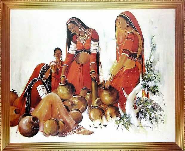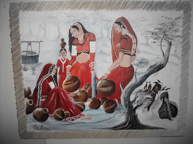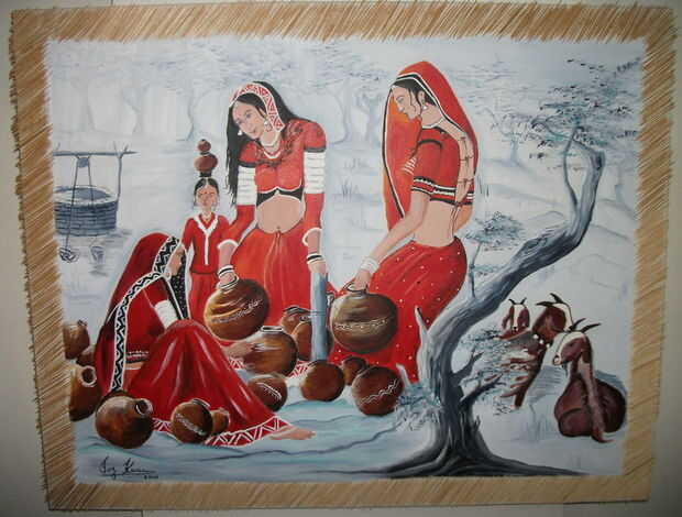 se trata de una pintura que fue magistralmente trazada en lienzo por mi mamá. Sólo tomar crédito para tomar la foto y haciendo cosas como recortar, etc.. Y mi mamá toma crédito sólo para recrear y adición de extras en la obra de arte original en http://www.dollsofindia.com/dollsofindiaimages/paintings/indian_women_PI07_l.jpg
