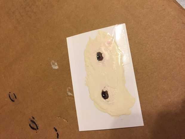 Con poco de pintura, color en alrededor de los ojos en la tarjeta para que de color coincide con la parte blanca de los ojos de los retratos. Yo soy ninguna artista y todos que parecíamos tener puesta alrededor era pintura de la pared de magnolia y agregamos un bolígrafo rojo para subir la calificación de mal.