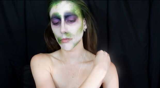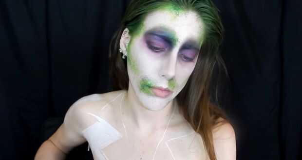 Paso 1: Base Pinté mi cara verde claro, luego he utilizado un delineador blanco para esbozar mi diseño.Paso 2: las cejas Usé una verde lima como la base de las cejas, luego he utilizado una sombra de ojos negra mate en la parte superior muy ligera, e