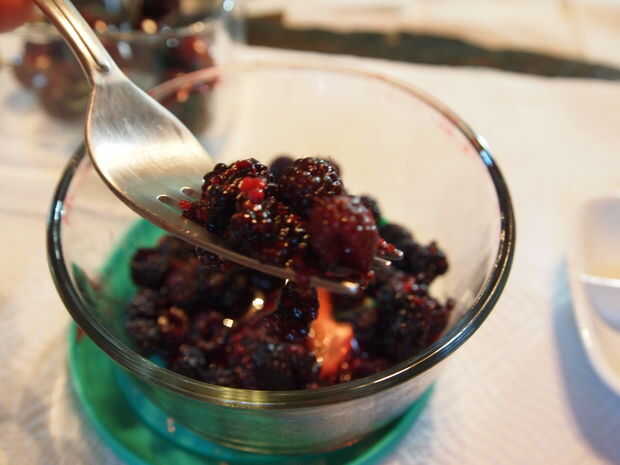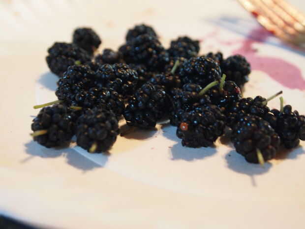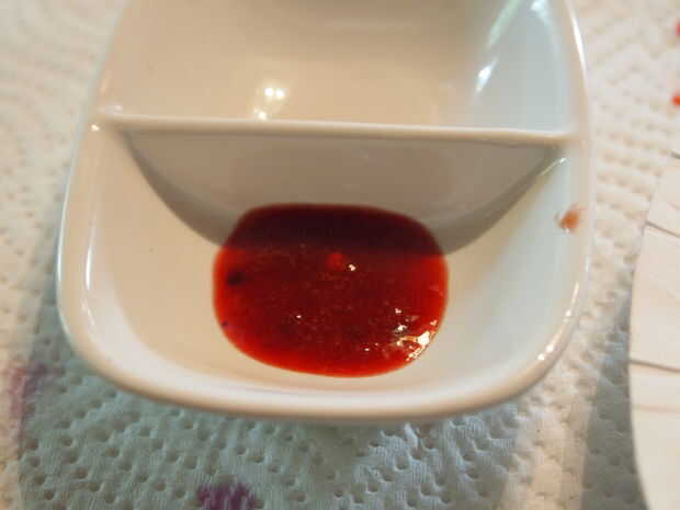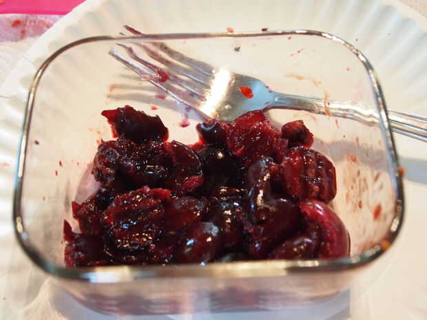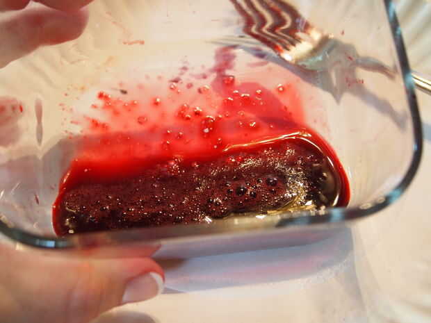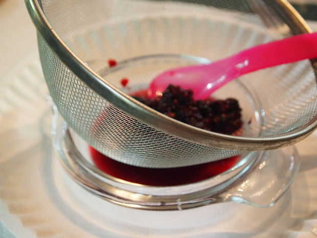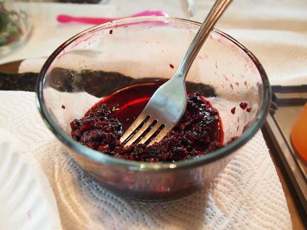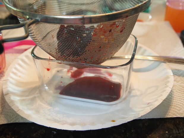 Asegúrese de tener a mano un delantal y un montón de toallas de papel y tazones de fuente. Recoger la fruta que se va a utilizar en tazones de fuente. Luego triturar la fruta con un tenedor y ponerlo luego a través de un colador (puré más) para terminar de recoger todo el jugo. Algunos artículos son mejor hervidos para recoger los pigmentos, pero para este Instructable está utilizando los métodos más rápidos posibles - y sobre todo apenas se rompen para extraer el jugo.