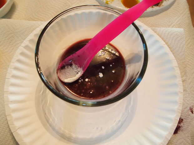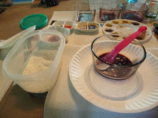 A continuación, agregue una pequeña cantidad de harina a cada una de las pinturas que ha creado - para ayudar a espesar un poco. La cantidad que añades es suya - aunque he añadido aproximadamente 1/4 a un 1/2 cucharadita por taza de pintura. La pintura de la cúrcuma fue creada agregando el polvo de la cúrcuma luego la mezcla con una pequeña cantidad de agua. Agregar más agua si queda demasiado espesa. A continuación, puede tomar alguna pintura de cúrcuma y agregar algunos pintura baya para hacer tonos de amarillo a marrón.
