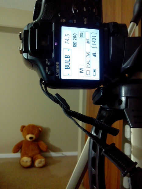 Para obtener el mismo resultado para esta pintura luz, sugiero que utilizar el ajuste Bulbo para su velocidad de obturación. Capturas de ajuste bulbo luz como quieras siempre y cuando usted ha pulsado el botón durante el período de tiempo requerido. Por lo tanto, si vas a delinear el oso de peluche, necesita alguien que presione el botón disparador hasta que haya terminado con el contorno. Apertura debe configurarse alrededor de f4.5. Y un ideal ISO 100 o 200 (200 en este caso).