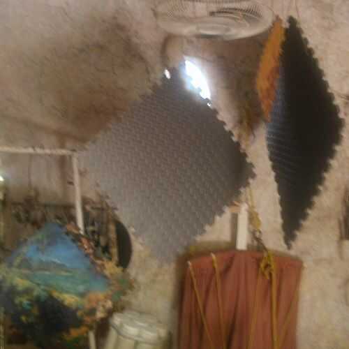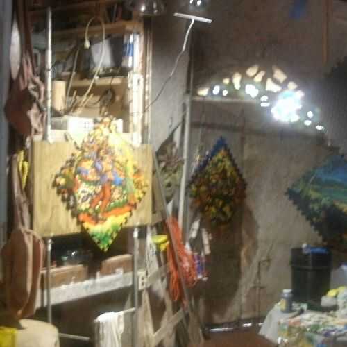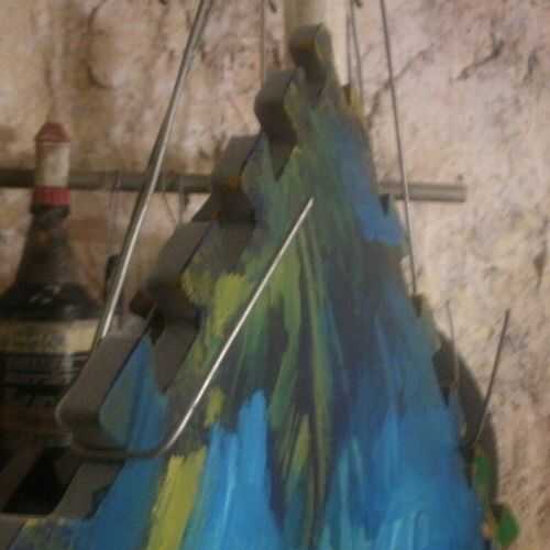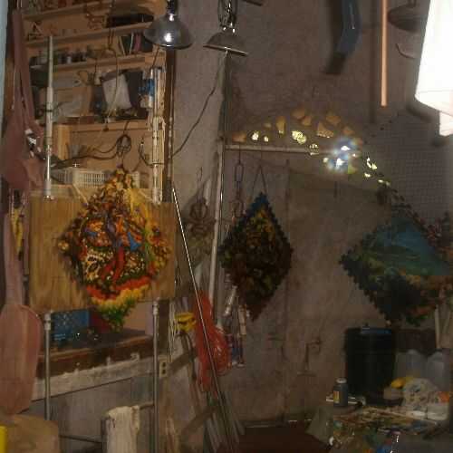 Me gustaría trabajar en varios cuadros a la vez. Para almacenar pinturas medias, hacer soportes de alambre elástico que enganchan en los bordes ondulados y me dejaron colgar en el aire. Por un lado mantiene fuera del alcance de mis gatos, que les gusta afilar sus garras en material mate de piso.
