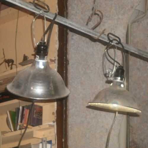 Luces de trabajo de la abrazadera a una pieza horizontal de la tubería suspendida desde arriba. Utilizar bombillas fluorescentes de luz diurna.