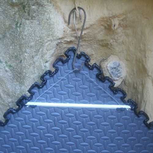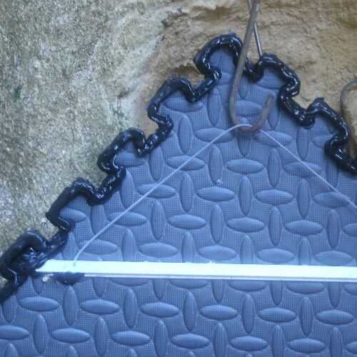 Los tapetes de goma tienden a la deformación cuando está colgado en una pared. El marco de la silicona tiende a mantener el tapete deforme. Trabajo una pieza de refuerzo canal de material de aluminio en la parte trasera para impedir más deformaciones. y Dame puntos seguros para sujetar el cable colgante. Yo uso pegamento gorila a la mayor parte de a la superficie posterior de la alfombra del piso y cerrar los extremos del aluminio en el marco de silicona con silicona más. Hasta el momento, no hay problemas.