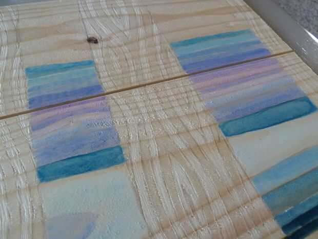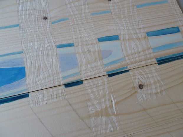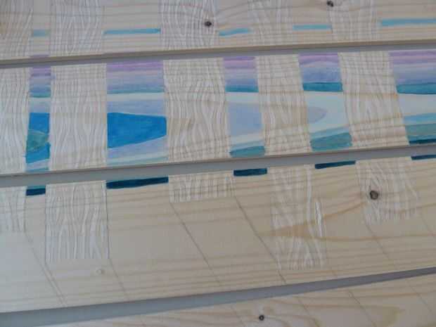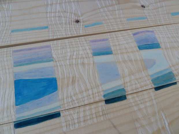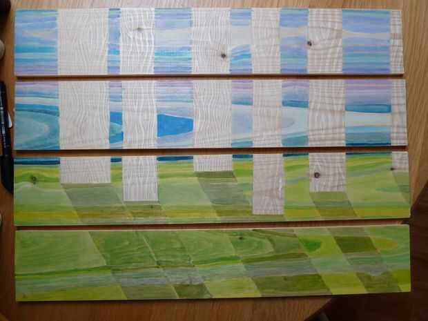 Cuando vino a pintar el fondo, decidí no pensar en mis bocetos en todo. Cuando vi el grano de madera natural, supe lo que quería hacer: pintar las piezas creadas por los granos, pero utilizan la pintura que se ha suavizado mucho para mantener el aspecto natural de la madera visible.
