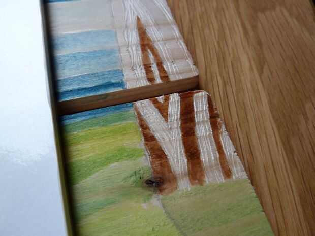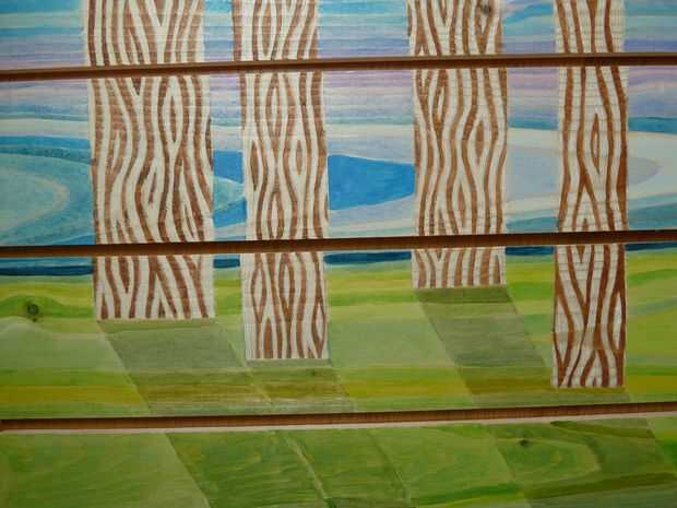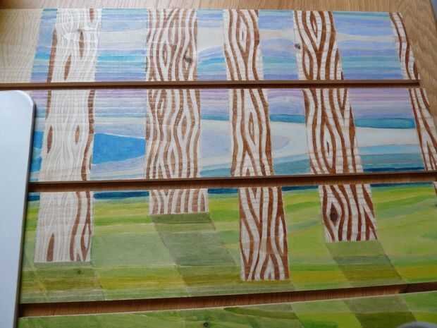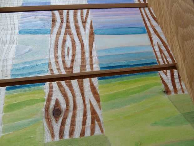 Toma pintura acrílica marrón y mezclar con un poco de agua, pero no tanto como utilizado para el fondo. Utilice un cepillo pequeño para llenar en las líneas de los árboles que no han sido tallados.