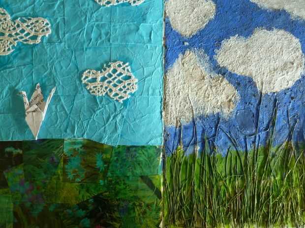 1. papel, un cielo de papel azul arrugado, diferentes recortes de revista verdes y una grúa de origami que vuelan por el aire. También he añadido las nubes cortadas de encaje.