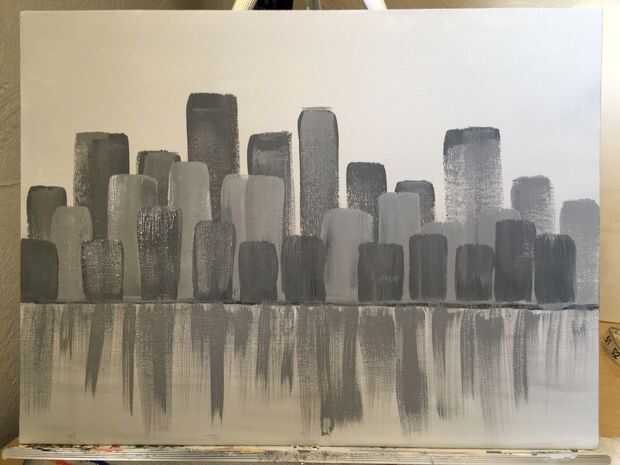 Frote un poco de pintura gris en el pincel y muy ligeramente, el cepillo hacia abajo desde el horizonte, haciendo un reflejo borroso en el agua debajo de los edificios.
