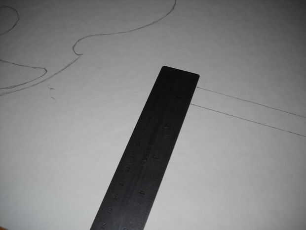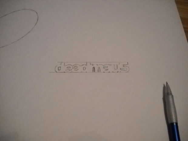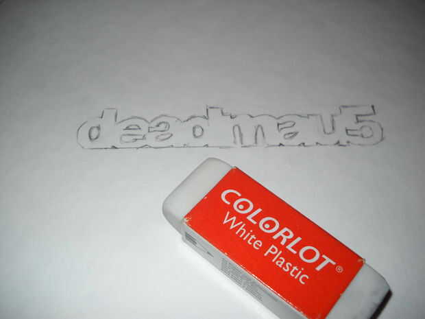 Ahora que tenía todo el material necesita, procedí a utilizar mi lápiz y regla para dibujar las líneas con las que me gustaría seguir mientras pintaba.  Este paso es básicamente para tener algo que pintar en, y usted puede desordenar algo que es fácilmente fijable. La pintura no es borrable. También, la única razón que he utilizado la regla era para asegurarse de que la inscripción era cuadrada con el fondo y una letra no dramáticamente sobre tamaño del resto. Cuando terminé haciendo las letras, borrar las líneas de exceso hasta que fue sólo el logo de deadmau5.