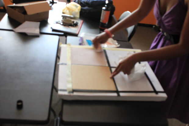 Usar un pincel o un rodillo para extender en una capa uniforme de inkodye. Intente tan duro como usted puede para no ir más allá de la cinta marcada. Si tiene diferentes colores, asegúrese de que usted lave o cambie su cepillo entre las plazas. Limpie cualquier exceso cuando termines! Esto es importante porque asegura la impresión se convierte uniformemente y el tinte no condensa en los negativos