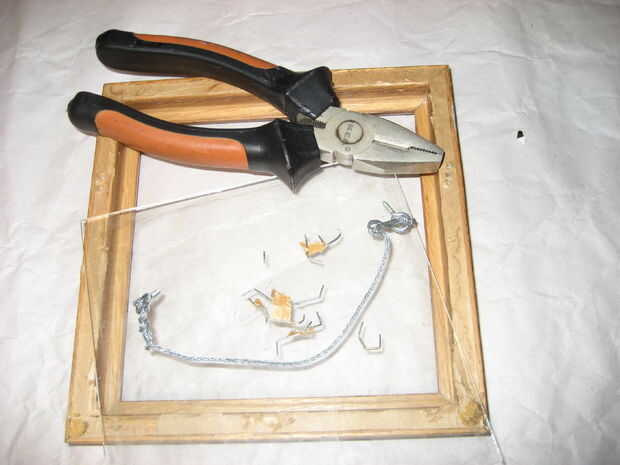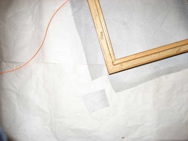 El marco que lo compré tenía algunas grapas y alambres para eliminar antes de comenzar.  Establecer el marco en la pantalla de licencia suficiente pantalla alrededor del marco para tirar sobre la espalda (esta pantalla es aproximadamente 1 el 1/2" más grande alrededor).  Corte las esquinas de la pantalla.