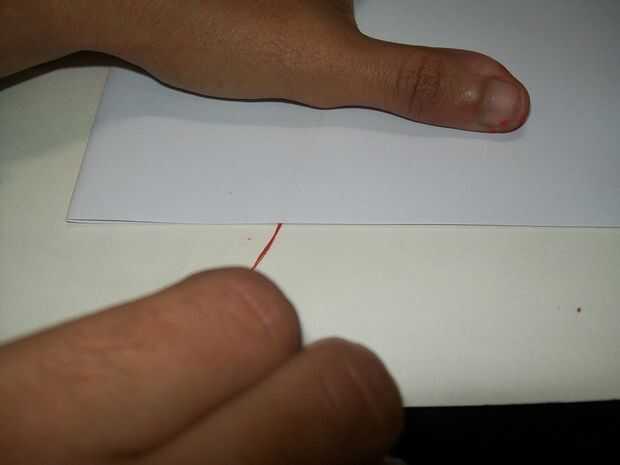 7. con una mano presionando el papel, utilice el hilo para estirar el otro extremo mientras se mueve en un patrón de zig zag. Hacerlo continuamente hasta que el hilo entero hacia fuera.