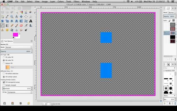 Entonces, usando seleccionar -> invertir, seleccione la zona fronteriza de 10 píxeles y pintar con la herramienta Cubo de llenar (con la opción de selección entero relleno). Puede ser cualquier color, pero utilizar algo como amarillo o rosa por lo que destaca mejor.