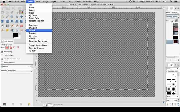 Quiero añadir un borde para cada capa. Esto me ayudará a alinear las capas más tarde en Inkscape. La manera de hacer esto es seleccionar toda la capa (selección -> todo), luego la seleccione -> opción Shrink encoger la selección 10 píxeles.
