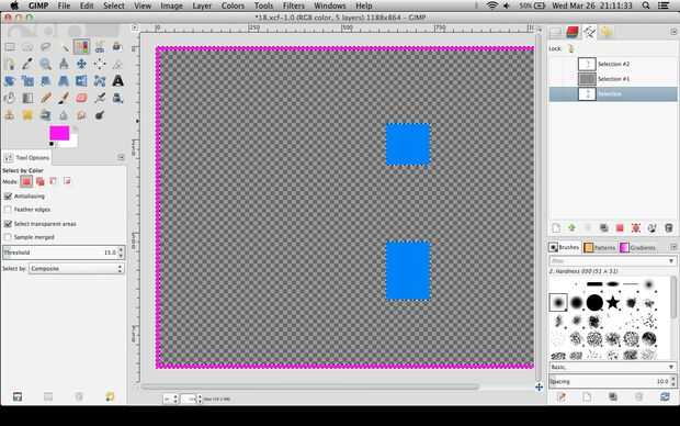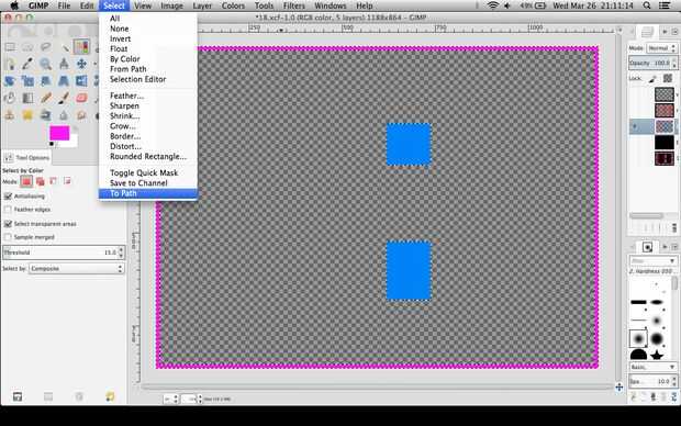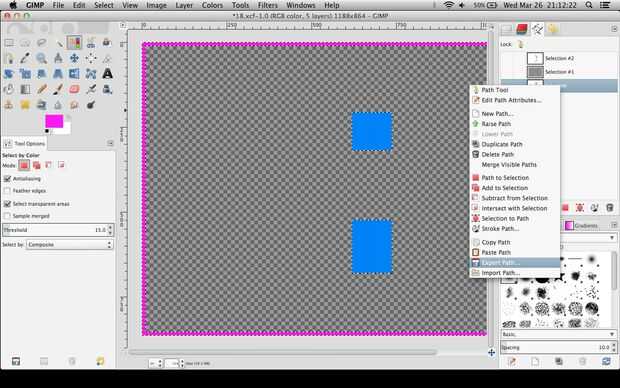 Seleccionar el área transparente entre mis colores mediante la selección de herramienta de Color y utilice Select -> opción de menú al camino para crear una ruta desde los bordes de la selección de la zona transparente.