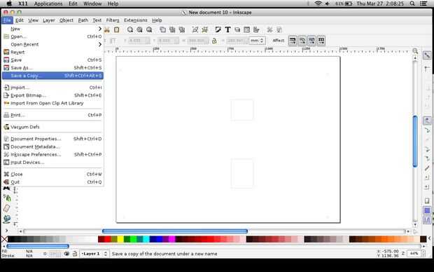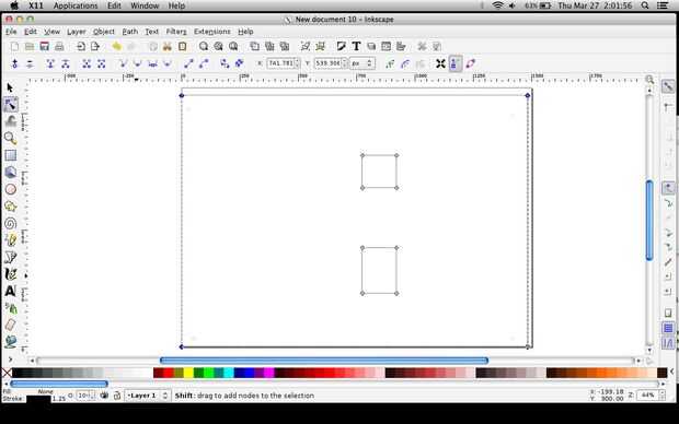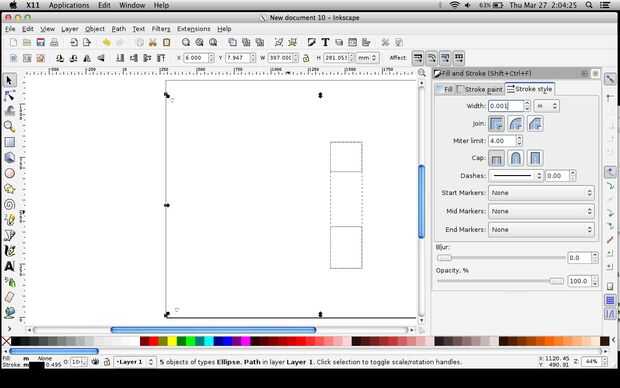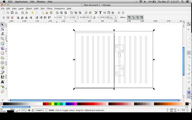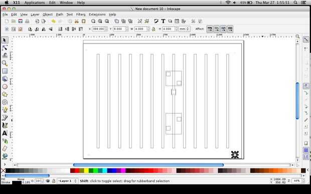 I eliminar todos los paths, excepto uno y asegúrese de que está todavía en la posición 0,0. Seleccione el trazado de la frontera utilizando los caminos de editar nodos la herramienta y bórrela. A continuación, seleccione todas las trayectorias (Editar -> seleccionar todo) y cambiar su anchura de trazo a 0,001 pulgadas. (Pestaña estilo de trazo del objeto -> relleno y trazo)