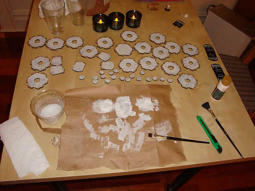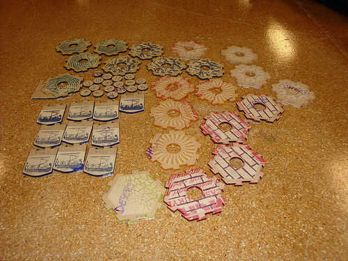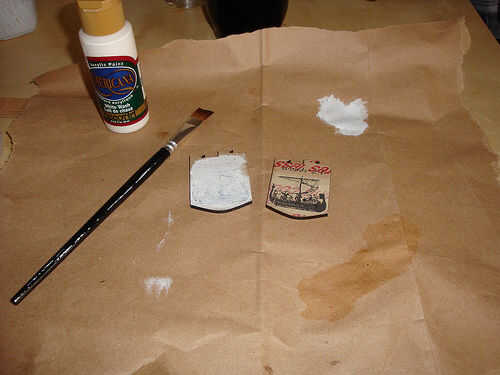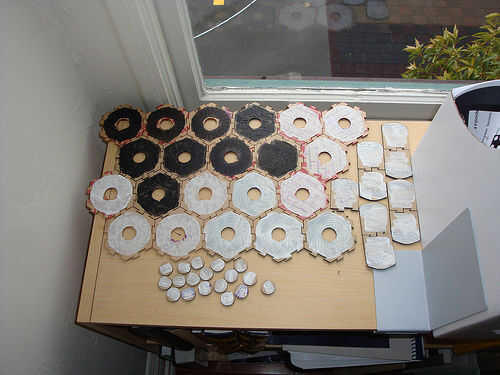 Probé algunos experimentos con mi quà colorido que trabajó menos de perfectamente. Pintura en blanco transparente blanca de los azulejos para las ovejas era agradable, pero mejor en una mesa oscura. Pintura negra en azulejos gris oscuros para el mineral de azulejos no era convincente. Mucho mejor sería invertir las ilustraciones antes grabado y luego pintar con blanco en los aspectos más destacados de la imagen en lugar de negro en las sombras.