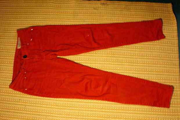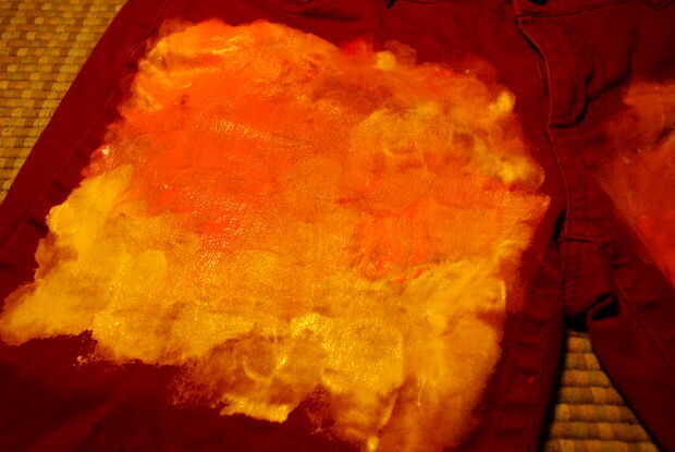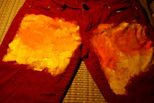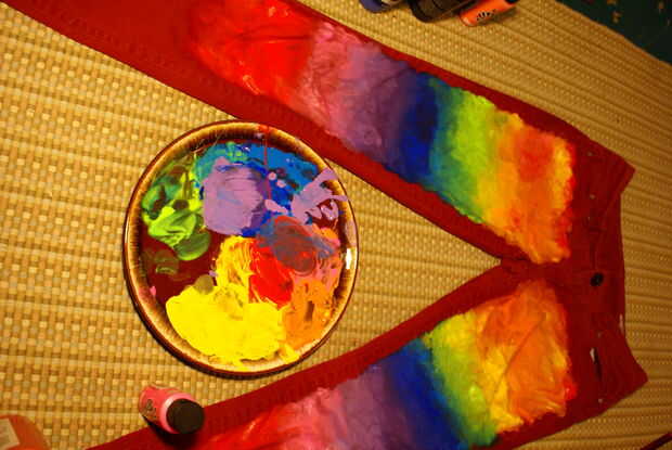 Me decidí a hacer un arco iris. Pintar los pantalones de costura para coser en la parte delantera de los pantalones. Puede ser más fácil poner en y la marca de arriba de la rodilla. Los pantalones pueden ser un poco duro las primeras veces que usted los usa. He pintado debajo de la rodilla, y hubiera sido más cómodo no había. Después se lavan varias veces, no son incómodos.