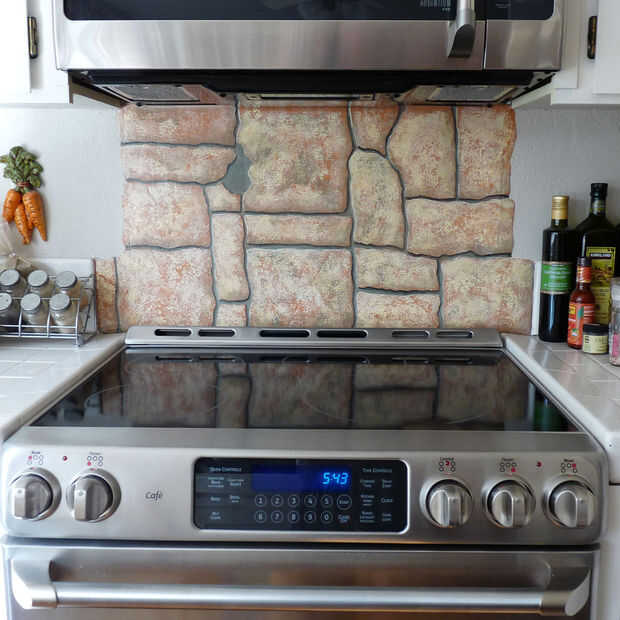 Cuando reemplacé mi gama antigua de una sola pieza con electrodomésticos nuevos, me quedé con una gran franja de paneles de yeso sin terminar. Mirar mis opciones y no tener gusto de la mayoría de ellos, decidí pintar un muro de piedra del faux. Estoy bastante contento con el resultado, y más importante aún, así que es mi familia.