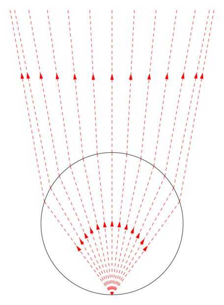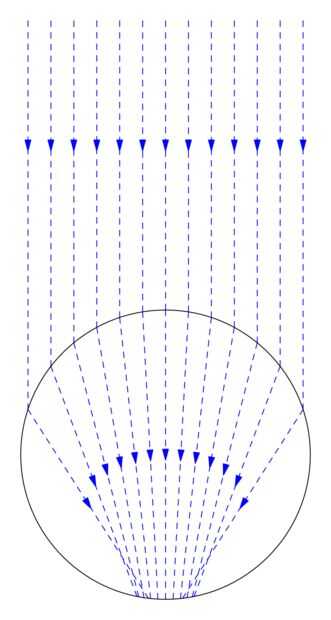 Esferas diminutas de vidrio están incrustadas en la pintura reflectante. Como se muestra en las dos ilustraciones aquí, las esferas se primer (casi) enfocar la luz a un punto en la parte posterior de la esfera, frente a la fuente. Allí la luz se refleja en la pintura. La acción lente ahora actúa en reversa y la luz reflejada es enviarlo en (casi) la dirección vino de.